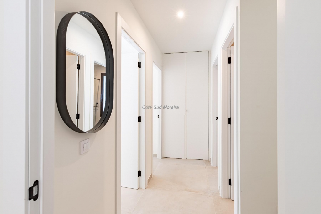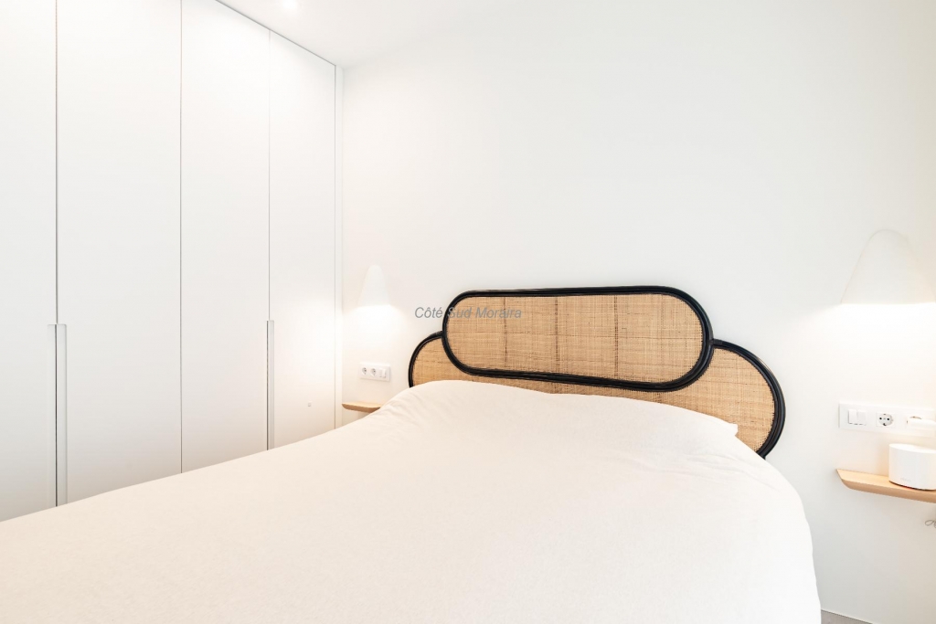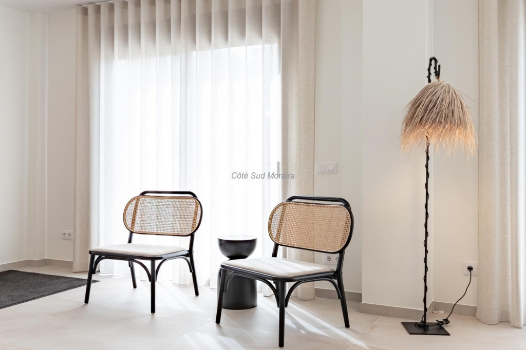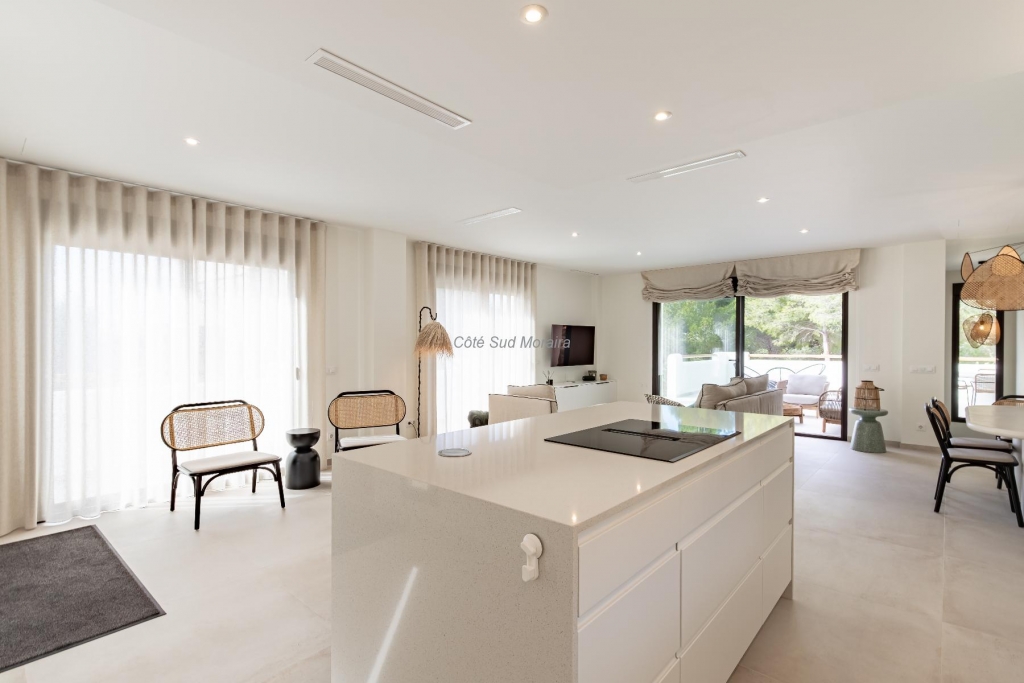 Dans le quartier exclusif de San Jaime, directement sur le parcours de golf de Benissa, se trouve cette villa neuve de style Ibiza (2025) pleine de charme. La propriété offre 161 m² d'espace de vie sur un terrain spacieux de 1 002 m² avec une orientation ouest et une vue magnifique. La villa dispose d'un espace de vie ouvert et lumineux, d'une cuisine moderne, de trois chambres et de deux salles de bains luxueuses. À l'extérieur, vous pourrez profiter de plusieurs terrasses, d'une élégante piscine et d'une grande terrasse sur le toit avec vue sur le parcours de golf. Une combinaison unique de calme, de luxe et de style de vie méditerranéen sur la Costa Blanca.