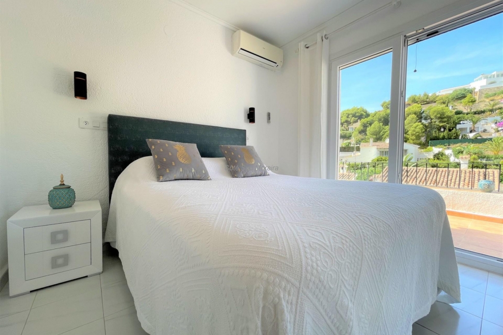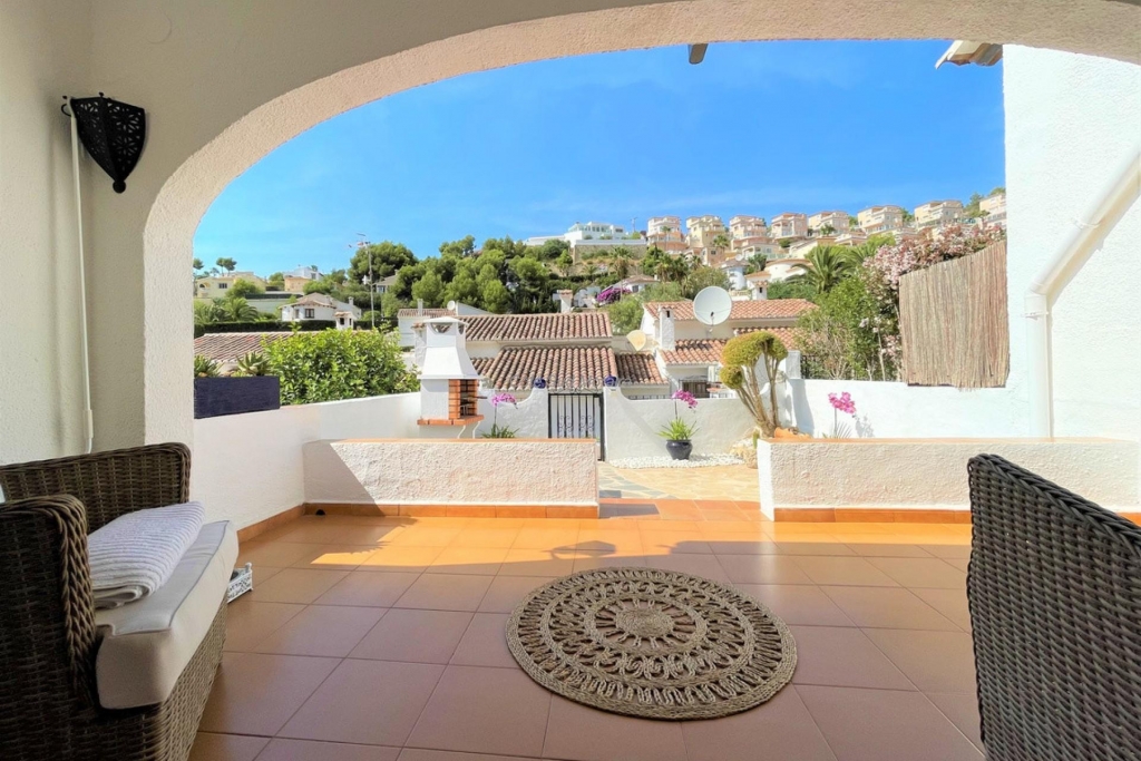 Un bungalow impeccable et entièrement rénové, situé à seulement quelques minutes en voiture de Moraira. De magnifiques espaces extérieurs spacieux orientés à l’ouest et à l’est avec vue sur la mer. Le tout joliment carrelé et parfaitement présenté. Accès depuis la terrasse exposée ouest au salon/salle à manger, cuisine ouverte neuve avec accès à la terrasse exposée est, une salle de douche et des placards de rangement. Un escalier intérieur mène à deux chambres doubles avec placards intégrés, une salle de douche et, depuis la chambre principale, accès à une terrasse offrant une très belle vue sur le Peñón de Ifach et la mer. Belle piscine communautaire. Climatisation chaud/froid dans toutes les pièces, fibre optique, nouveau chauffe-eau électrique, nouveau barbecue (sur la terrasse extérieure), nouvelles fenêtres et portes à double vitrage de haute qualité. Rénové entièrement en 2022. Les charges de copropriété 750 € par an. Peut être vendu entièrement meublé. Tout simplement magnifique !