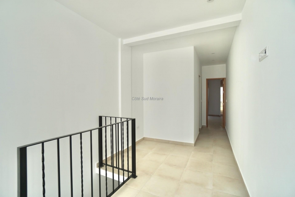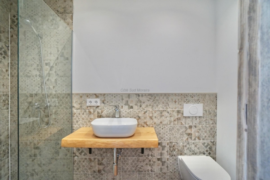 Le superbe escalier ouvert mène au premier étage, où se trouvent deux grandes chambres doubles ainsi qu’une salle de bain familiale entièrement rénovée. À ce niveau, vous trouverez également la chambre principale, dotée d’un balcon privé avec vue sur la terrasse et la piscine, et sa propre salle de bain attenante décorée avec soin.
