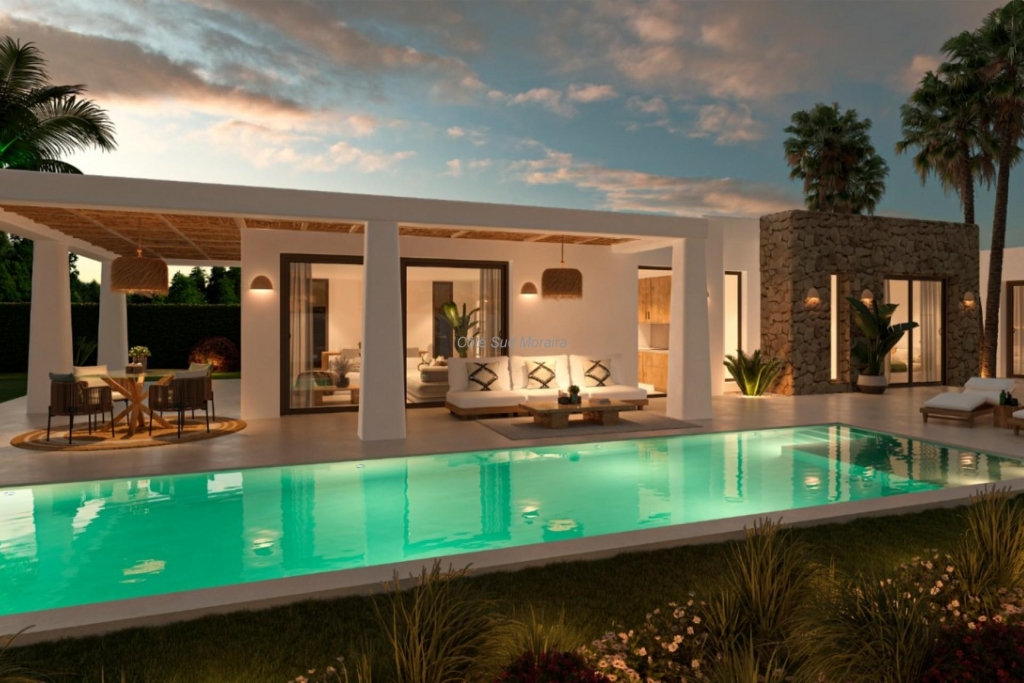 Cette villa moderne neuve offre quatre chambres doubles, chacune avec sa propre salle de bain attenante, et un toilette invité. L'espace de vie et de salle à manger ouvert se connecte harmonieusement avec une cuisine entièrement équipée et des terrasses orientées au sud, y compris une piscine de 42 m². Les espaces intérieurs sont dotés de sols en micro-ciment, de fenêtres en aluminium et d'appareils sanitaires noirs. Les équipements supplémentaires incluent le chauffage au sol, la climatisation gainable, deux places de parking sous un pergola, un local de stockage de 37 m² et 155 m² d'espace terrasse avec une pergola ombragée. La propriété offre une vue sur la montagne Montgó et les collines environnantes, et l'agencement est conçu pour un style de vie méditerranéen confortable.