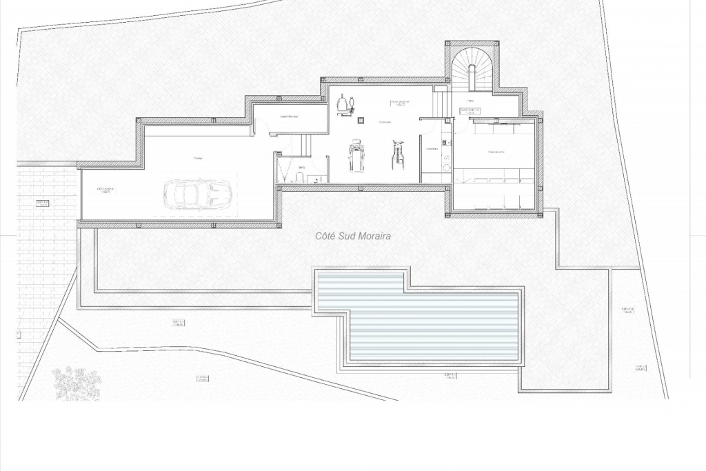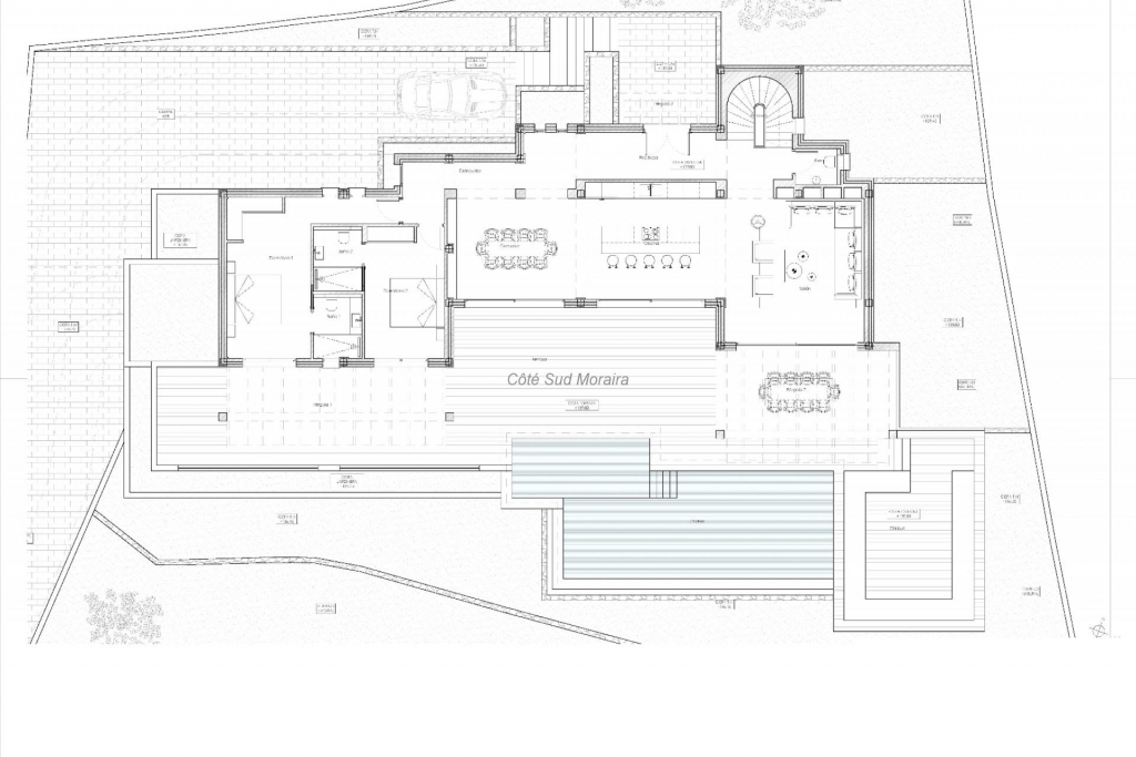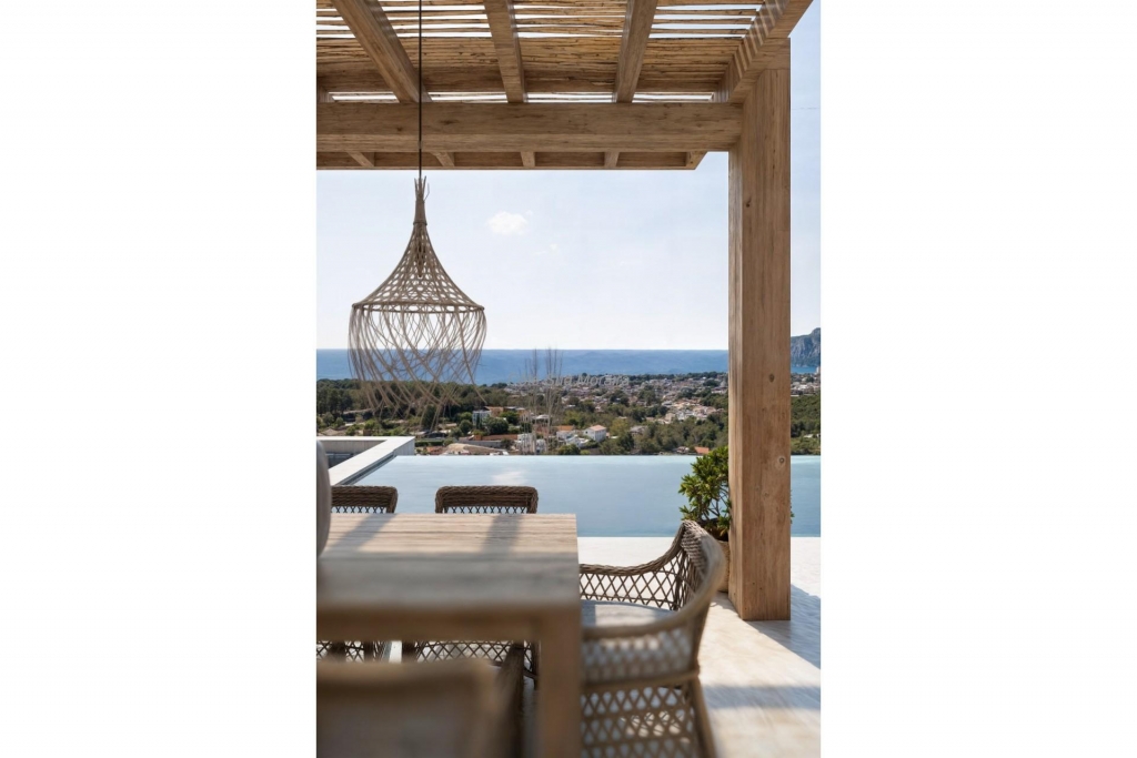 Villa neuve de luxe au style Ibiza à Benissa, sur un terrain de 1 129 m² avec une surface construite de 374 m², vue panoramique, 4 chambres avec salles de bain attenantes, sous-sol avec garage, salle de fitness, cinéma privé et buanderie, salon spacieux avec cuisine ouverte, salon séparé, suite parentale avec dressing, chauffage par le sol, climatisation et finitions de haute qualité.